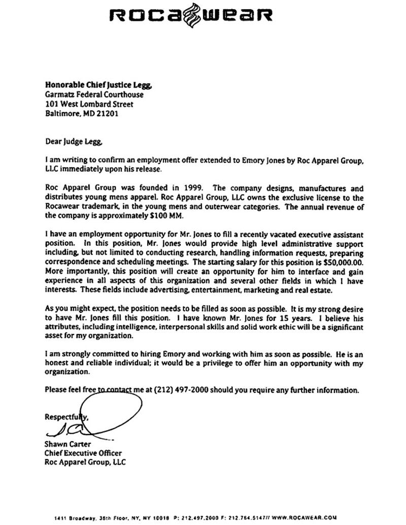 Ten years after Jones went to prison, Jay Z wrote a letter to a federal judge that was included in a series of documents as part of Jones’s motion for a sentence reduction. In the letter, which was acquired by The Smoking Gun, the rapper writes that there is “an employment opportunity for Mr. Jones to fill a recently vacated executive assistant position” at his company Roc Apparel Group, which came with a $50,000 starting salary. “It is my strong desire to have Mr. Jones fill this position,” the CEO added. “I have known Mr. Jones for 15 years. I believe his attributes, including intelligence, interpersonal skills and solid work ethic will be a significant asset for my organization.”