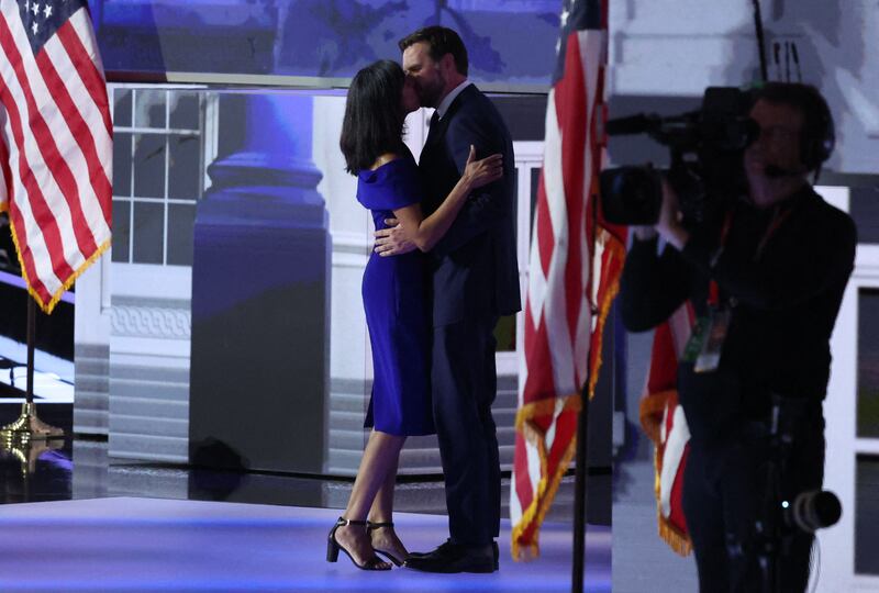 Usha Vance and her husband, J.D. Vance, share a kiss on stage at the Republican National Convention in Milwaukee.