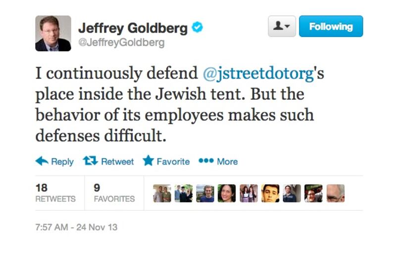 And having gotten that out of the way: What is up with Jeffrey Goldberg?As news of an interim U.S.-Iran deal broke on Saturday night, a J Street employee retweeted (from his personal account) a tweet from Zbigniew Brzezinski, which read: “Obama/Kerry = best policy team since Bush I/Jim Baker. Congress is finally becoming embarrassed by Netanyahu’s efforts to dictate US policy.”