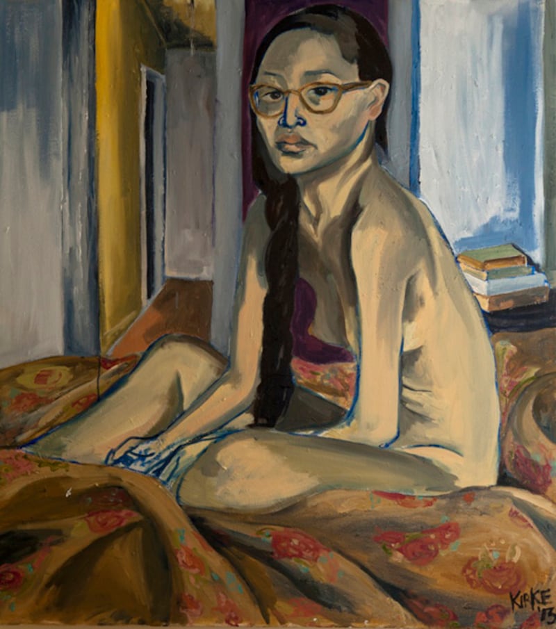 For the exhibition, Kirke selected seven oil-on-canvas portraits of females who are closely intertwined with her life, along with two self-portraits in watercolor. All of her subjects sat for her, including her personal trainer Cadence Dubus, who she painted nude, outstretched in an odalisque pose — “She’s a dancer mainly,” says Kirke. “I just really do love her way of looking at fitness.”