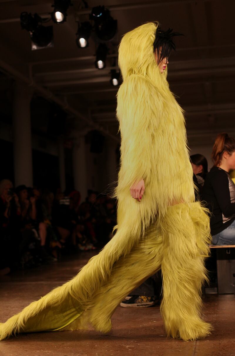 Scott's take on monsters meant a wide array of shaggy faux furs that were cut into jackets, boots, and even mohawk wigs. Ninja Turtle green, animal prints, eyeballs, ironic slogans, and squiggle faces were present as well, and their combined force created an entertaining, albeit slightly alarming, sense of fun.