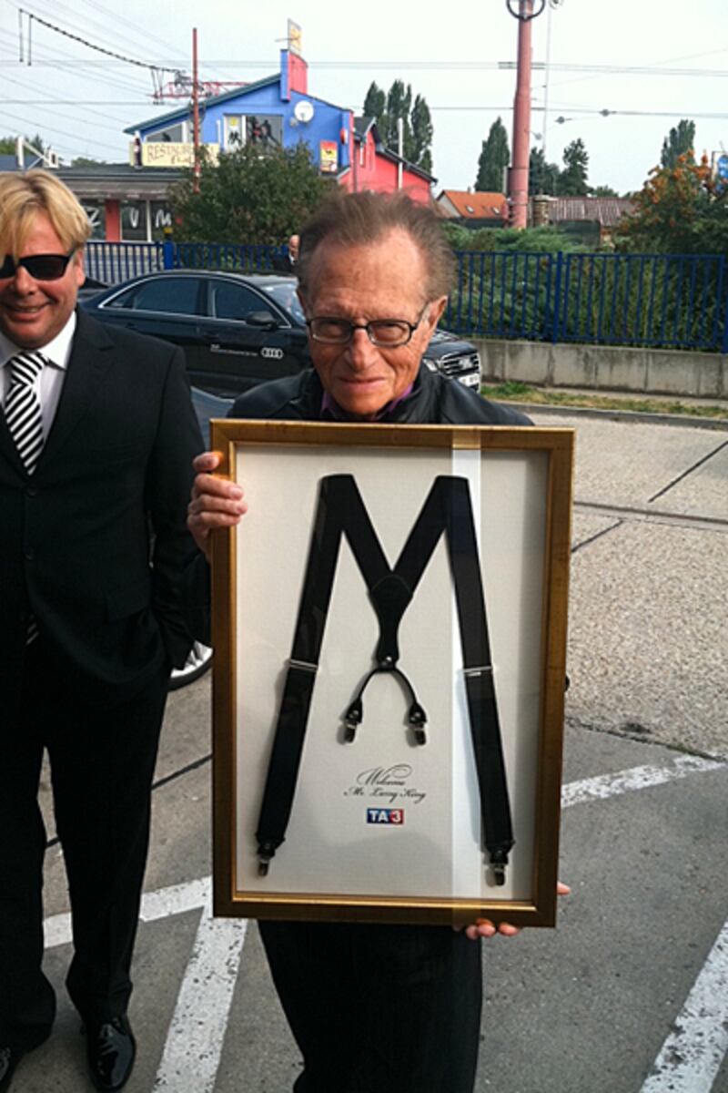 Larry King traversed the Atlantic to present an award in Slovakia, and was surprised with a gift himself. The legendary talk show host tweeted a picture of a framed pair of his trademark suspenders. “Having a great time in Slovakia...just got a gift from the TV network here...” King tweeted. He then received a Lifetime Achievement Award at the Emmys a few days after returning from Europe.