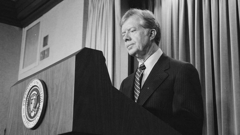 President Jimmy Carter announces new sanctions against Iran in retaliation for taking U.S. hostages in 1980.