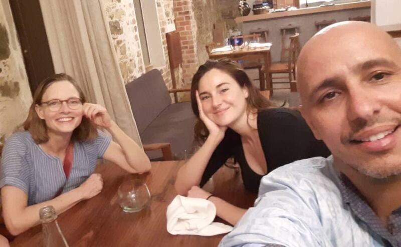 The Mauritanian actors Jodie Foster and Shailene Woodley with the real-life Mohamedou Salahi.