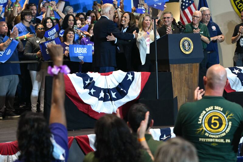 US President Joe Biden (C-L) embraces US Vice President and Democratic presidential candidate Kamala Harris during a campaign rally at the International Brotherhood of Electrical Workers (IBEW) Local 5 in Pittsburgh, Pennsylvania, on September 2, 2024.