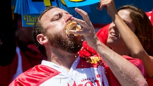 Though Chestnut remains dominant on the hot dog eating circuit, Kobayashi is no slouch. He won the Nathan’s contest every year from 2001 to 2006 and is widely credited with bringing his sport into the mainstream. He tied Chestnut in 2008 with 59 dogs, only to lose in an “eat-off” round that saw Chestnut “complete” five dogs in 50 seconds, with Kobayashi finishing his five a mere seven seconds later.