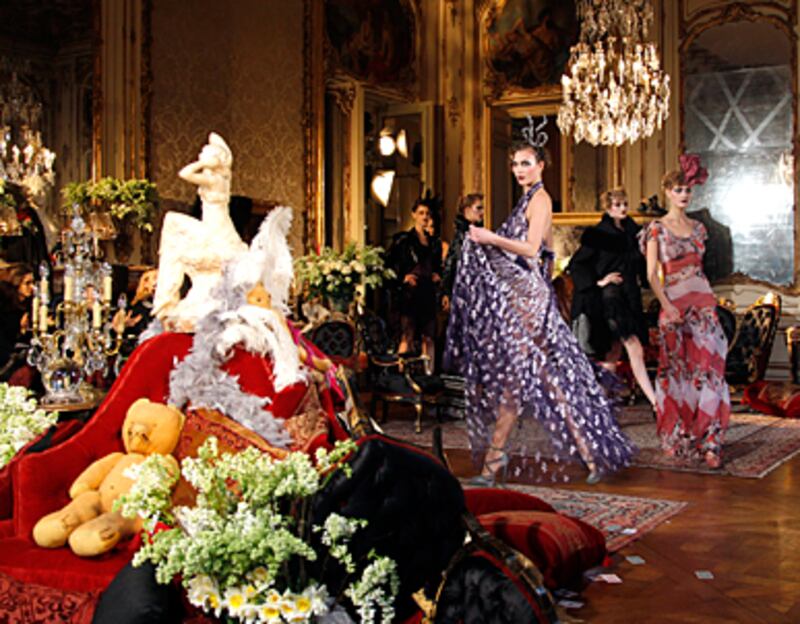 The small-scale presentation on the second floor of an elegant Paris townhouse on the chic Avenue Foch didn't have the theatrics of the usual John Galliano show. But it had the disgraced designer's signature romance and whimsy.