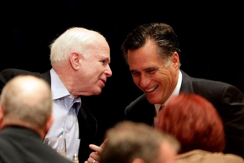 Dressed in his trademark blazer on Friday, McCain warned the gathering of GOP state chairmen that the election would be close and depended on their efforts to get out the vote. Left unmentioned was how he and Romney duked it out, not always pleasantly, for the 2008 presidential nomination. McCain focused instead on the GOP standards: the evils of Obamacare (an “exercise in sleaze”), class warfare, an “unsustainable deficit,” and how Romney “saved companies” while at Bain Capital.