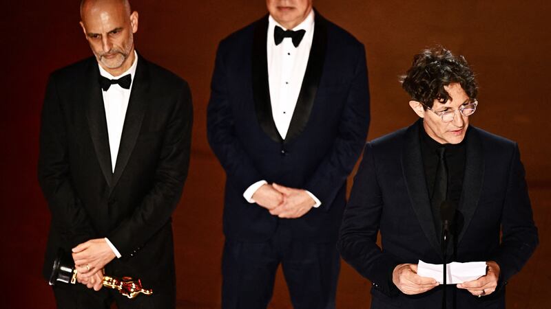 Jonathan Glazer accepts the award for Best International Feature Film for The Zone of Interest, flanked by James Wilson and Leonard Blavatni during the 96th Annual Academy Awards on Mar. 10, 2024.