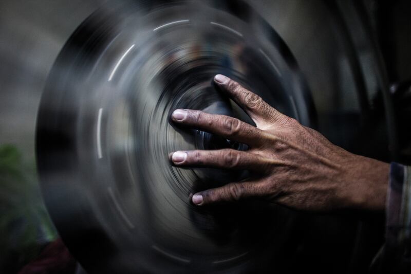 A projectionist winds a reel at Ariani Cinema in Pashtunistan Square, Kabul, June 2011.