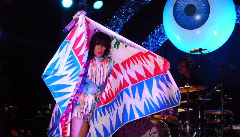 Karen O leads the Yeah Yeah Yeahs on stage as a punk-rock goddess, spitting water up in the air and trying out eccentric get-ups designed by Christian Joy. During the band’s It’s Blitz! album tour, she donned a reworked Native American costume with a kaleidoscope of colors.