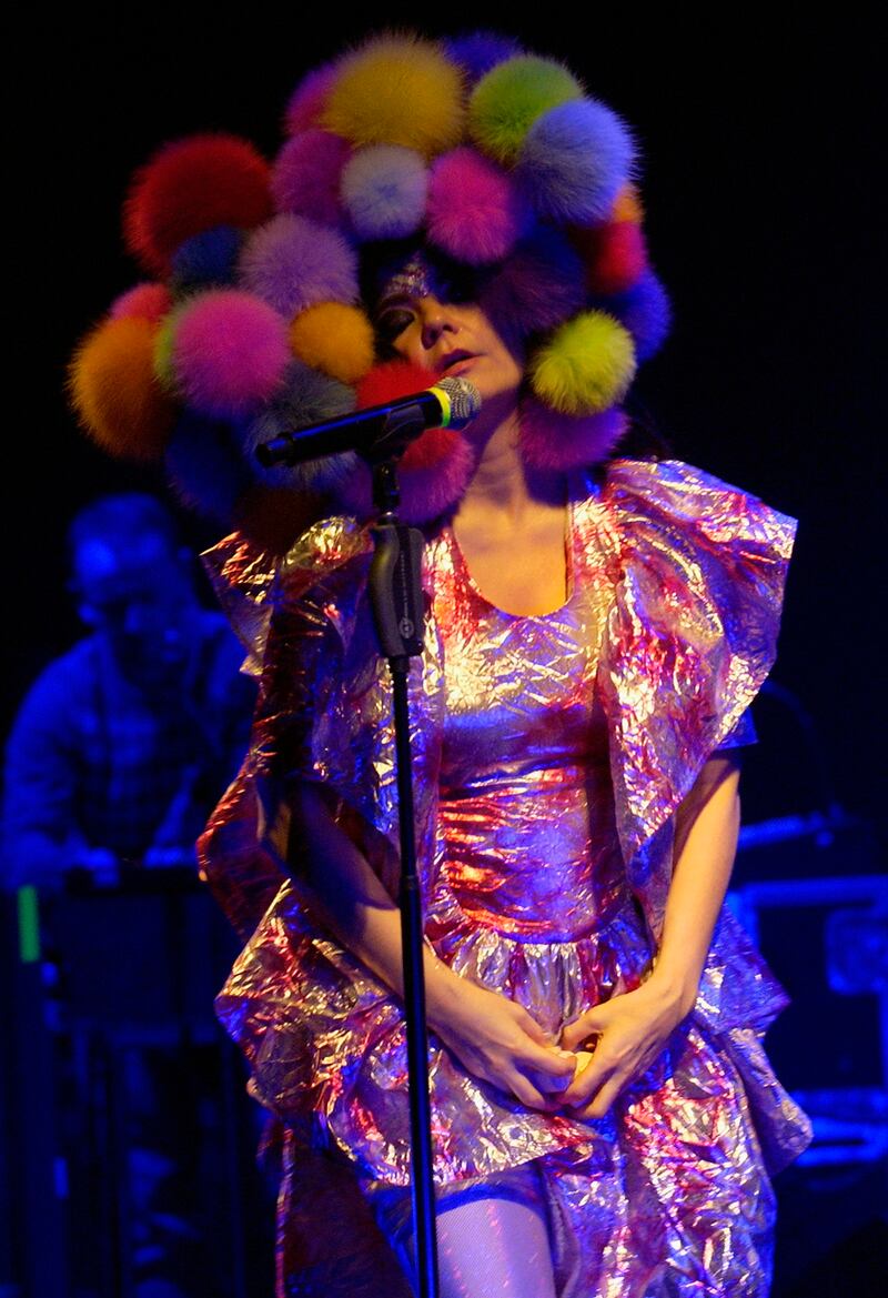 Icelandic diva Björk was last seen at the Hollywood Bowl in Los Angeles, at the end of her Biophilia Tour, sporting a prickly headpiece that made her head look like a magenta blowfish. During her 2008 Volta tour, she made a stop in London to wear this fuzzy-ball hat with something like an ice-skating outfit.