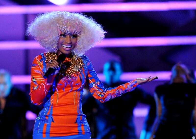The “Freaks” singer is no stranger to freaky outfits on stage. At an event for the troops in San Diego, Nicki Minaj wore a fluffy white wig with her multicolor dress.