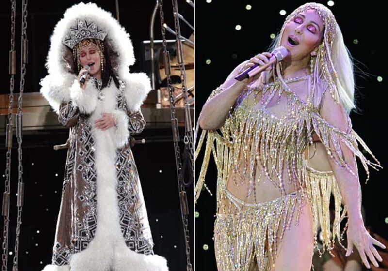 The queen of outrageous concert costumes had plenty of opportunities to showcase her eclectic style during her three-year farewell tour. At left, she tried out a snow-maiden look in February 2005 at the CenturyTel Center in Bossier City, Louisiana. At right, she dared to bare for an aquatic look in London in May 2004.
