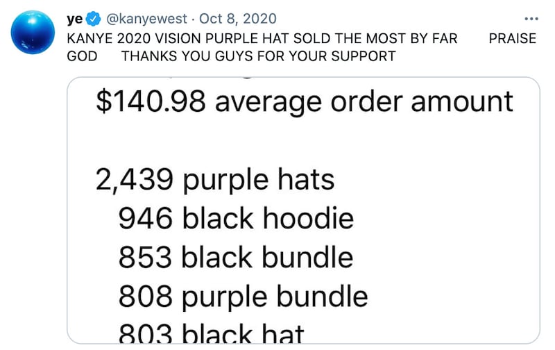 The campaign has to date collected $2.2 million from small-dollar donors, nearly all of it in exchange for campaign swag, not out of support for a Yeezy administration. Some of it was snapped up by entrepreneurial zoomers intending to flip the limited-edition collectibles in online marketplaces, scoring a few thousand dollars in easy cash. Price points on the site ranged from a $40 hat to a $200 Kanye 2020 Vision hat/hoodie bundle, but they list higher than that today in online marketplaces.