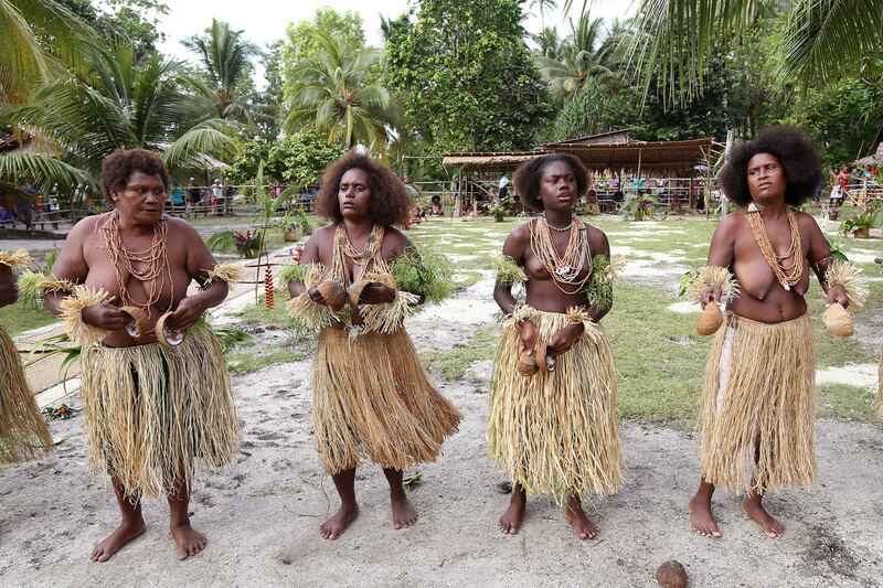 Kate Middleton got the giggles today when she was greeted by a party of bare-chested women on the tiny village of Marau in the Solomon Islands.