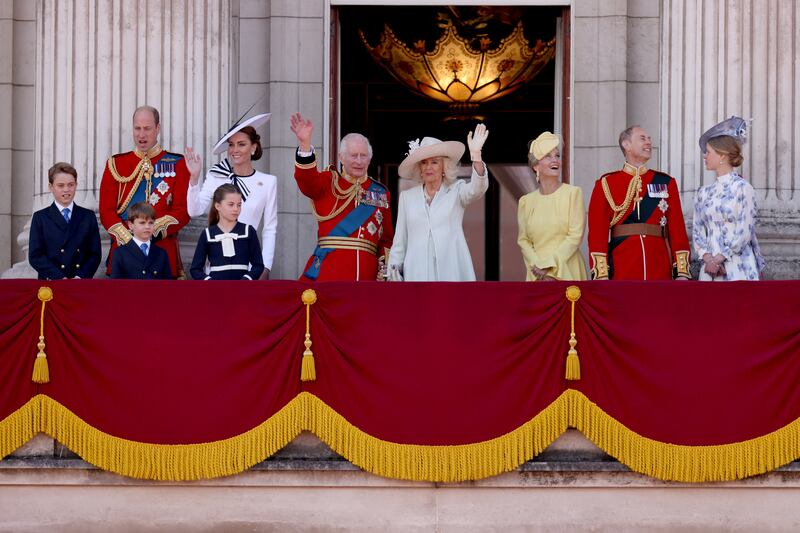 King Charles, Queen Camilla, Prince William, Princess Kate, Prince George, Princess Charlotte, Prince Louis, Sophie, Duchess of Edinburgh, Prince Edward, and Lady Louise Windso on June 15, 2024.