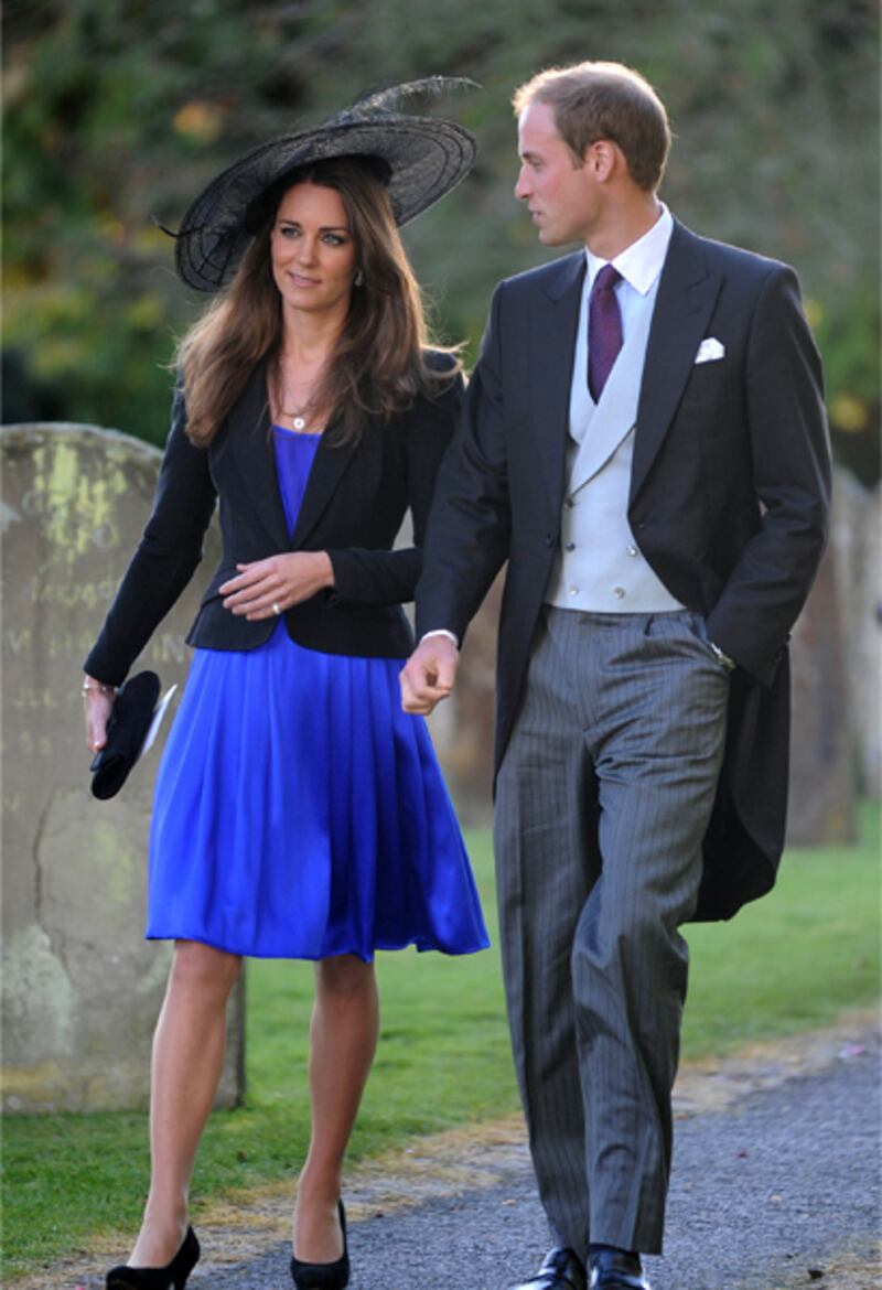 At the wedding of their friends Harry Meade and Rosie Bradford last October, Middleton wore a blue Issa dress with a fascinator hat.