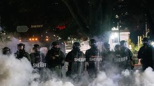 About ten minutes past curfew, a clutch of county sheriffs approached protesters, striking a parked car in the process, and emerged from their vehicle, guns drawn.