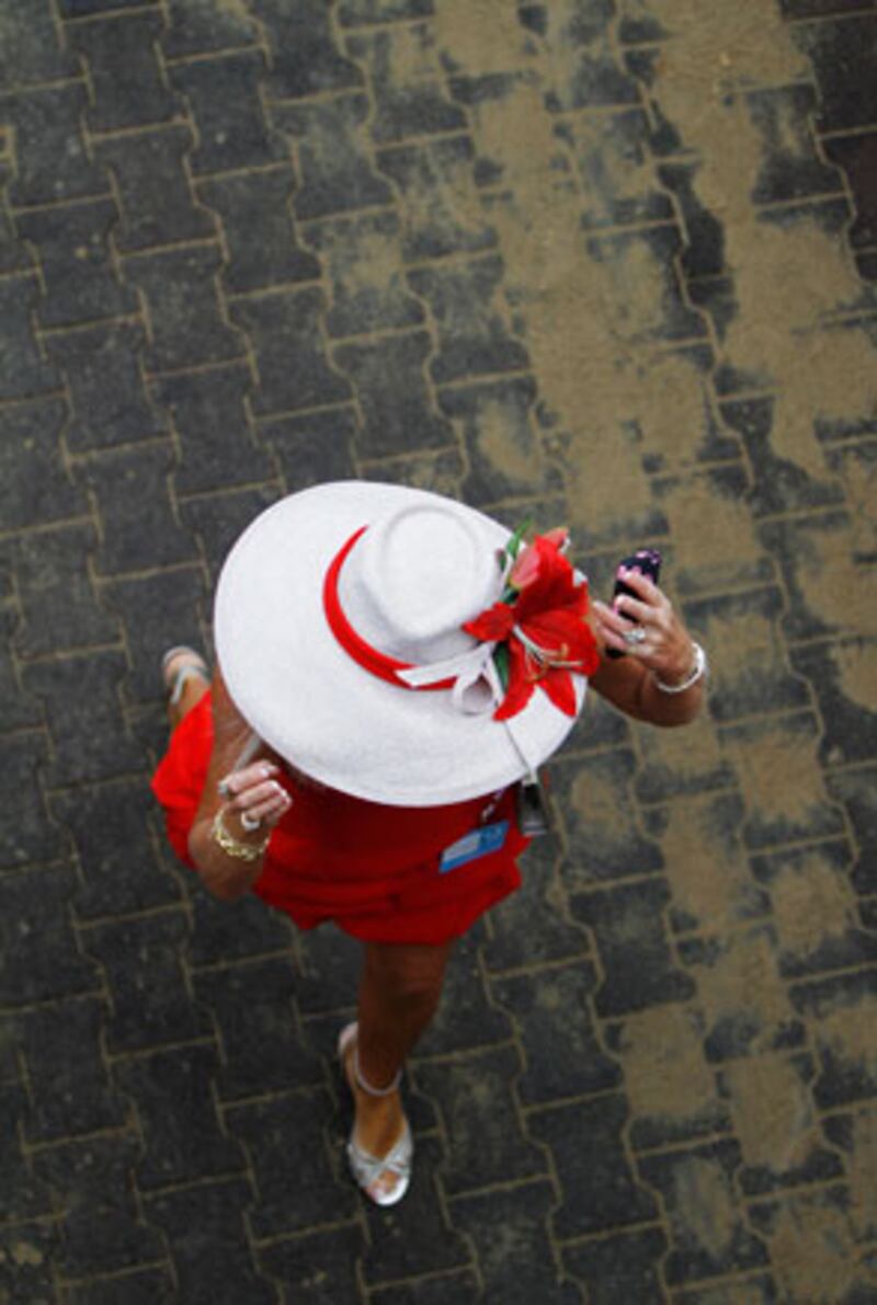 A fan wearing an equestrian-themed hat surveys the preliminary races.
