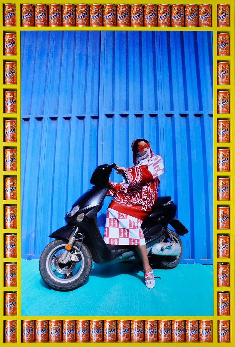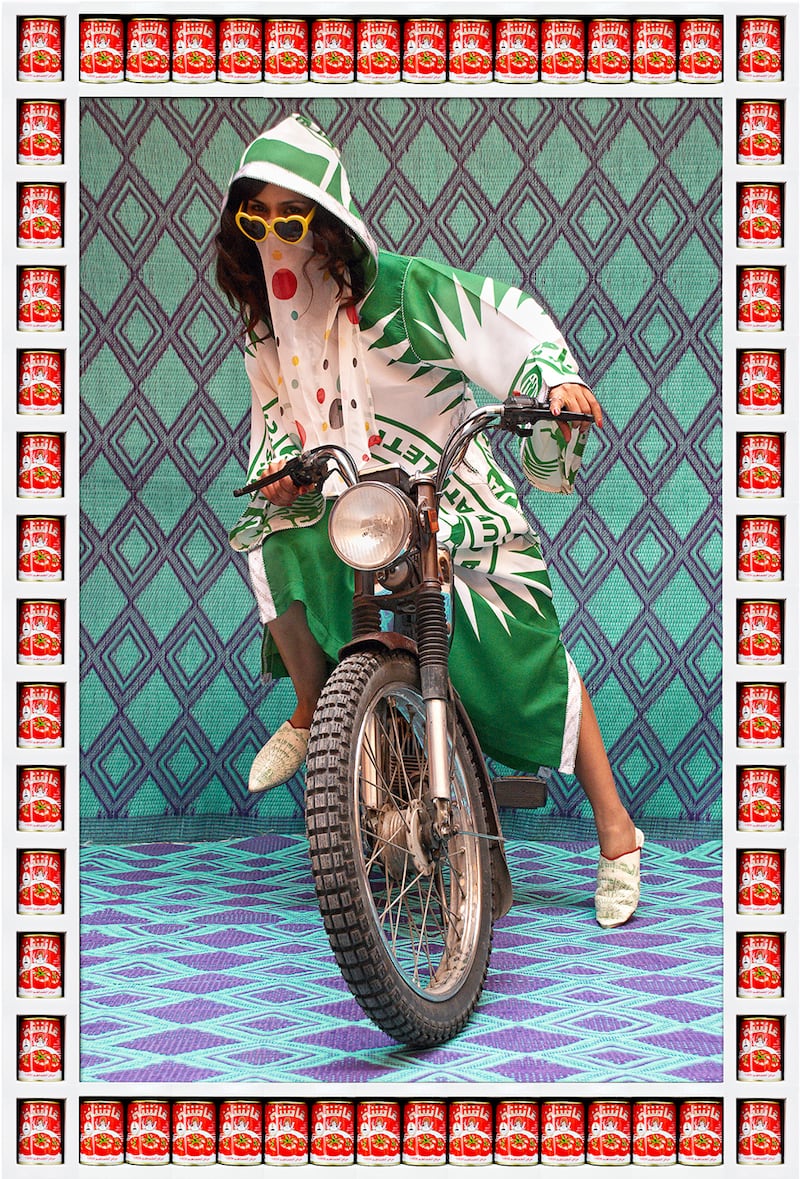 The idea of a motorcycle gang brings many things to mind, like leather, tattoos, and a "don’t eff with me" attitude. But, in a city where bikes are the main mode of transportation, what happens when the leather is replaced with women in camo abayas and Louis Vuitton slippers? London-based artist Hassan Hajjaj explores this identity shift in his solo exhibition, ‘Kesh Angels, on view at the Taymour Grahne Gallery in New York City through March 8. The photos were inspired by the lack of authenticity in a photo-shoot he did in Morocco during the '90s. "I realized everything—all the models, the photographer, the clothes—were from the west and Morocco was simply the backdrop. From then I said it'd be great to present my people in their environment in their kind of way of dressing, and play with it on a fashion level," he told Vice. Hajjaj modernizes traditional garb with polka-dot prints and high-fashion logos in his new series of photos that are reminiscent of an editorial spread. He juxtaposes these fierce women (who work as henna tattoo artists in Marrakesh) with frames of consumer products, linking the East and West while toying with different ways the Arabic culture is perceived.