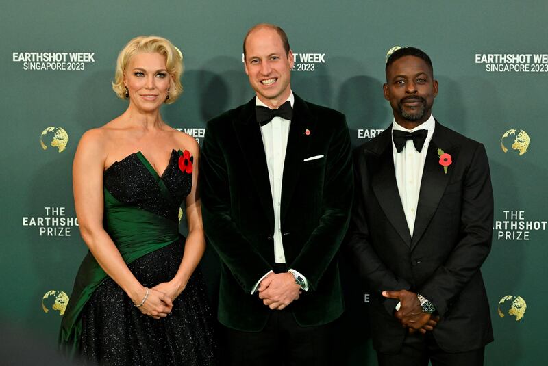Britain's Prince William, actress Hannah Waddingham and actor Sterling K. Brown pose for a picture on the green carpet for the Earthshot Prize Awards in Singapore November 7, 2023.