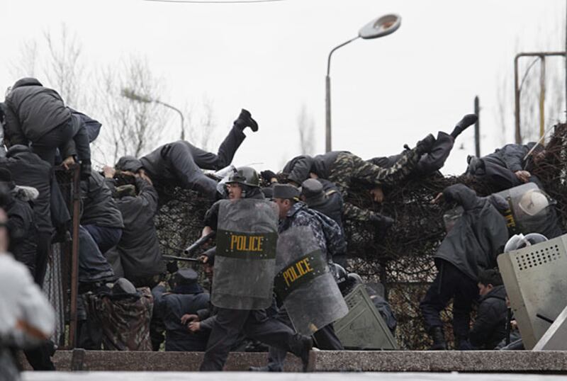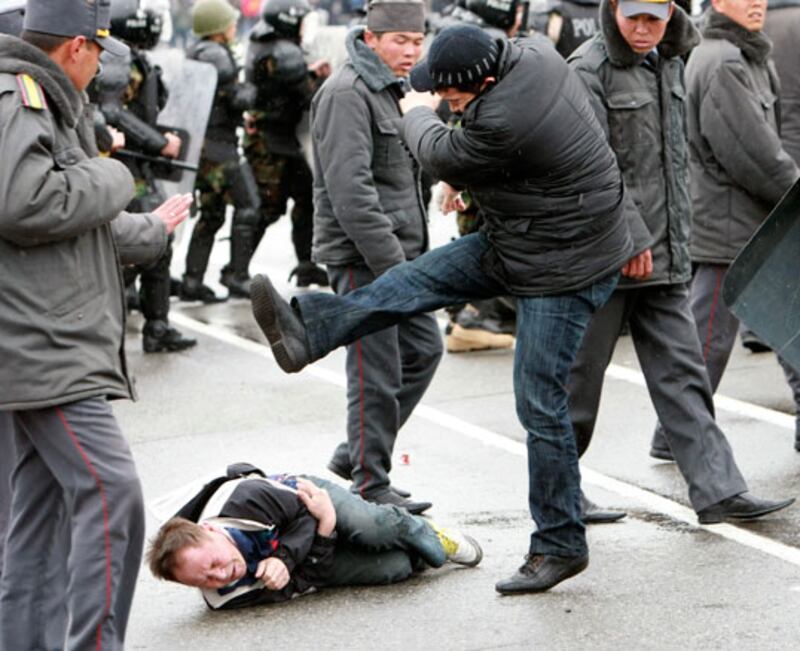 A plainclothes policeman kicks an anti-government protester in Bishkek, Kyrgyzstan, where protests erupted April 7. Kyrgyz forces fired on thousands of protesters after some tried to smash two trucks through the perimeter fence of the government building, said a Reuters reporter at the scene.