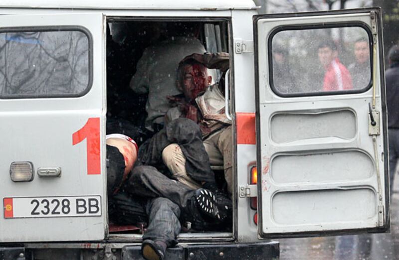 An ambulance packed with injured people prepares to leave the main government building in Bishkek.