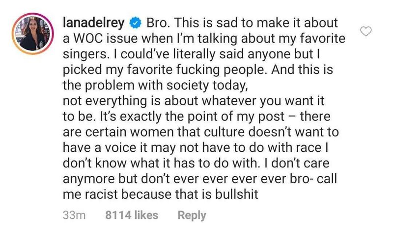 Minutes later, Del Rey continued, “Bro. This is sad to make it about a WOC issue when I’m talking about my favorite singers. I could’ve literally said anyone but I picked my favorite fucking people. And this is the problem with society today, not everything is about whatever you want it to be. It’s exactly the point of my post—there are certain women that culture doesn’t want to have a voice it may not have to do with race I don’t know what it has to do with. I don’t care anymore but don’t ever ever ever ever bro- call me racist because that is bullshit.”