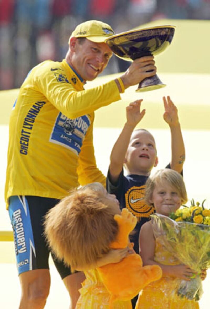 After winning his seventh consecutive Tour de France, Armstrong holds up his winner's trophy as his son, Luke, and twin daughters Grace, right, and Isabelle, look on.