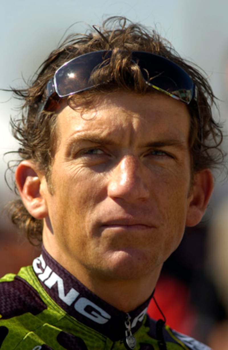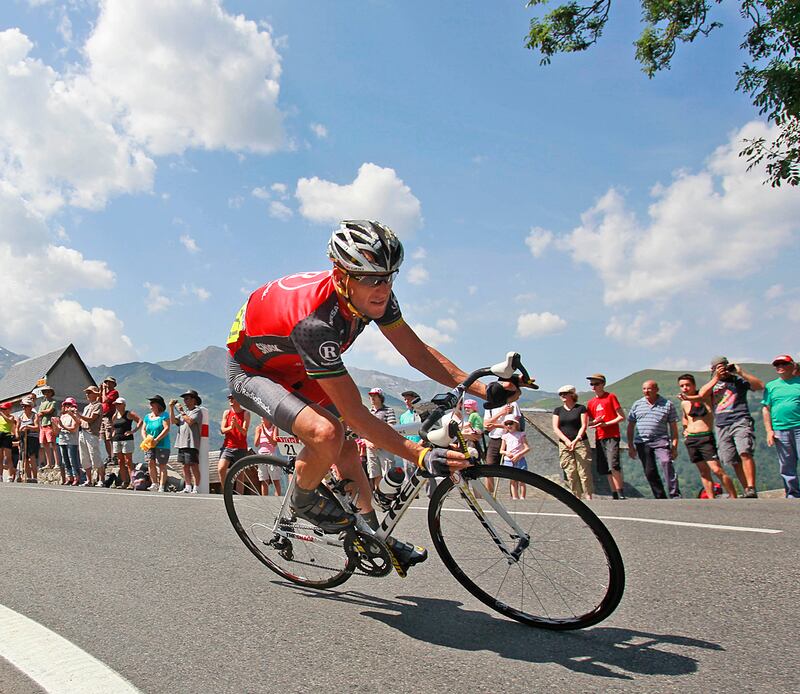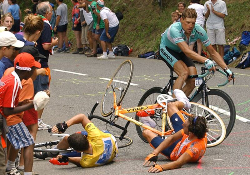 During the 15th stage of the Tour in 2003, Armstrong (in the yellow jersey) crashed on the final ascent in the French Pyrenees, as Jan Ullrich rode past. Armstrong won the stage and Ullrich finished in third place.