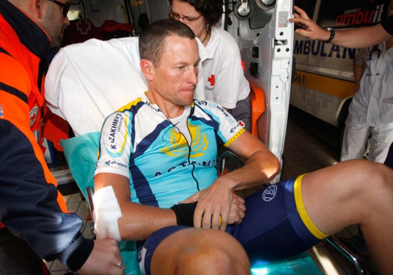In an early comeback race in Spain, Armstrong crashed in the first stage and fractured his collarbone.