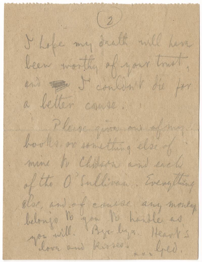 “I hope my death will have been worthy of your trust and I couldn’t die for a better cause. Please give one of my books or something else of mine to Chidson [Hume Chidson, a schoolfriend] and each of the O’Sullivans [family friends]. Everything else and of course any money belongs to you to handle as you will. Bye-bye. Heart’s love and kisses. xxx Ged”