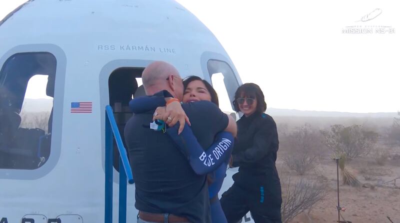 “Where are my babies?” she said after exiting the shuttle, clutching a soft toy. “There, over there, go see ‘em,” Bezos responded.