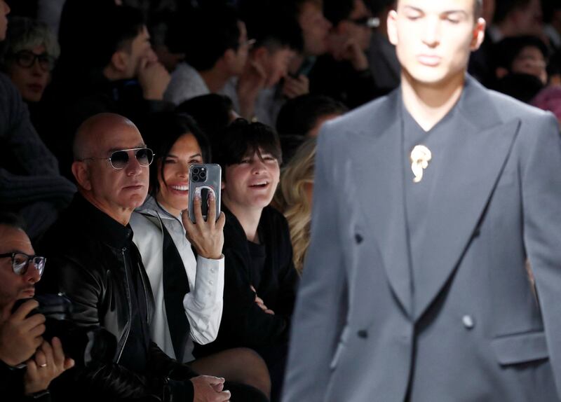 Jeff Bezos and Lauren Sánchez watch her son, Nikko Gonzalez, at the Dolce & Gabbana Fall/Winter 2024/25 men’s collection in Milan, Italy, Jan. 13, 2024.