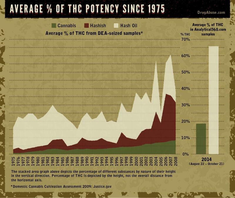 A recent study shows that marijuana itself has risen in potency—that’s THC percentage—from less than 1 percent in 1974 to, amongst award-winning strains, a potential staggering 24 percent in 2008. Naturally, hash and hash derivatives have gained strength as well, more than doubling in intensity over the same period.