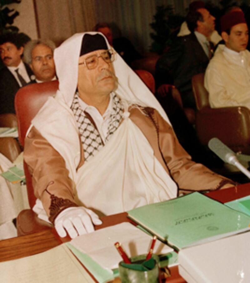 Just six months after the Lockerbie bombing, Gaddafi dons a white glove to avoid touching the “blood-stained hands” of fellow Arab leaders at a conference in Algiers in June 1988. Elsewhere at the conference, he pulls a white sheet over his body as a screen while Jordan’s King Hussein speaks; refuses to shake the hand of Moroccan King Hassan II; tans and sips coffee instead of listening to speeches one afternoon; delivers a speech railing against his colleagues as “imperialist lackeys;” and skips a summit dinner without even bothering to offer an excuse.