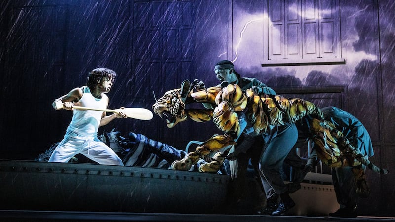 Among the five Olivier Awards Life of Pi won in London last year was a best supporting actor award for the seven actors who operate the show’s impressive puppet Royal Bengal tiger, Richard Parker. This creature—who really does become more terrifying as the performance continues—is both the nemesis and intimate of 16-year-old Pi (Hiran Abeysekera), first freaking him out at his family’s zoo in India, and then supposedly on board a rescue vessel, the two of them floating for many days on the high seas of the Pacific Ocean, with the tiger only kept from chomping down on our hero by the placating effects of an orange whistle.