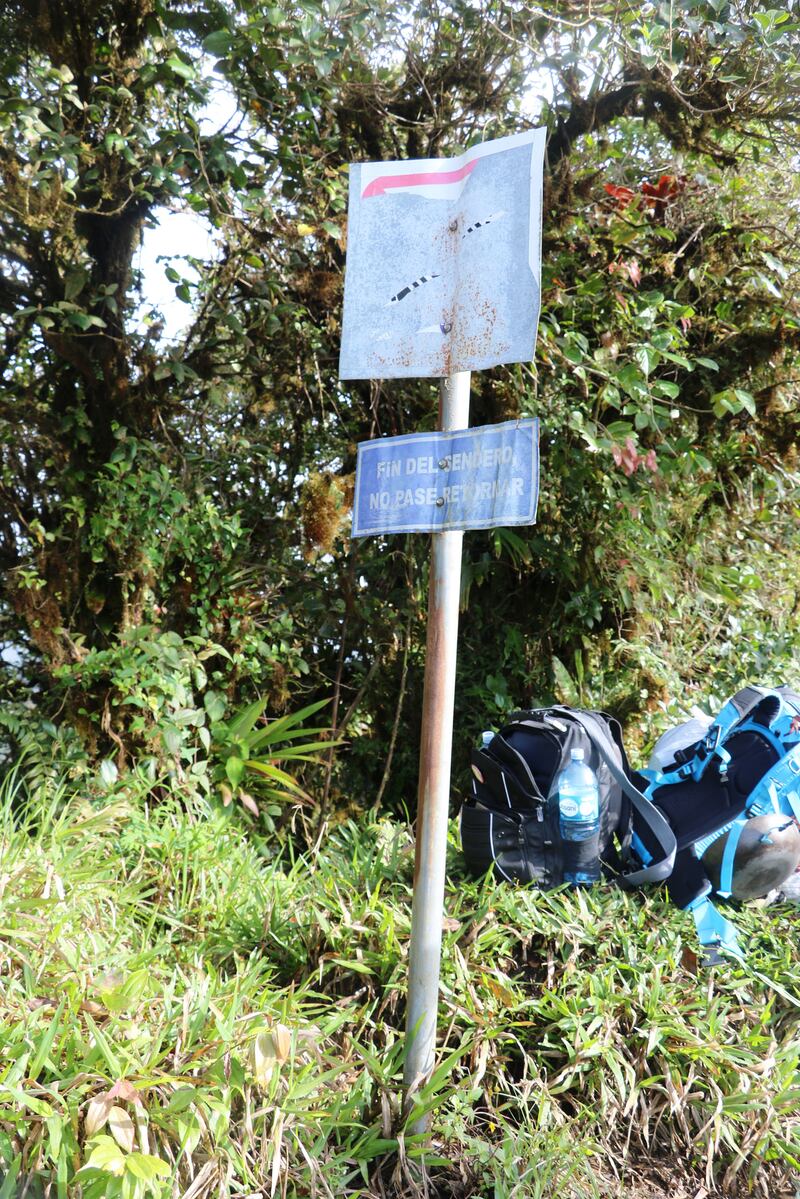 "The battered sign at the end of the Pianista Trail, atop the Continental Divide near Boquete, Panama. This sign reads "End of the Trail: No Return Passage," and was erected after the disappearance of Kris Kremers and Lisanne Froon, in April of 2014."