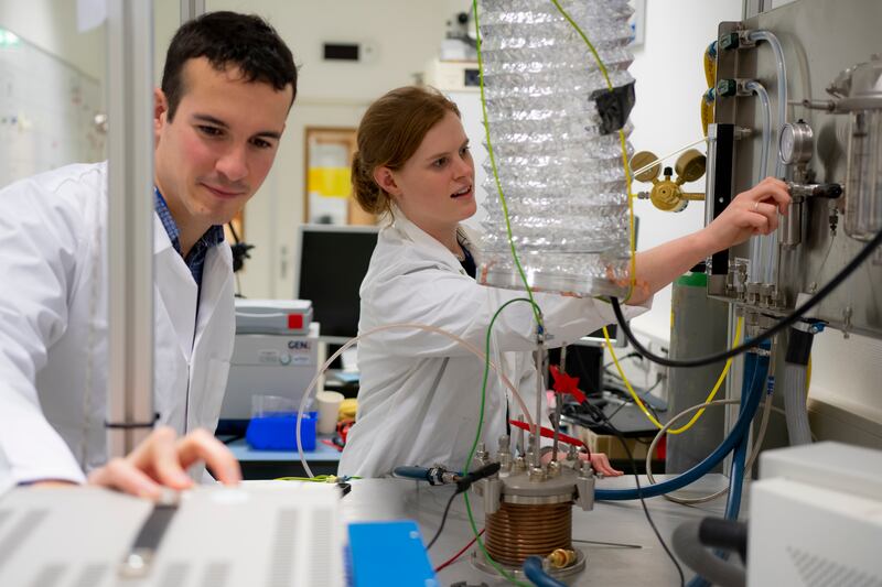 ESA research fellow Alexandre Meurisse and Beth Lomax of the University of Glasgow producing oxygen and metal out of simulated moondust inside ESA's Materials and Electrical Components Laboratory.