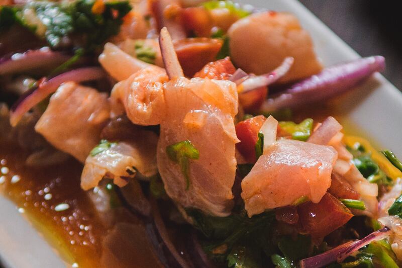 2. Combine Shrimp, citrus juice, veg mix(recipe above) and cilantro. Mix together. 3. Arrange ceviche on top of avocado, pouring over remaining liquid. 4. Mix together thinly sliced red onion and remaining ½ TBSP cilantro and pile high on top of fish. NOTE: It is important that the onions are VERY thinly sliced, lengthwise! 6. Finish with a sprinkle of cayenne. Serve.