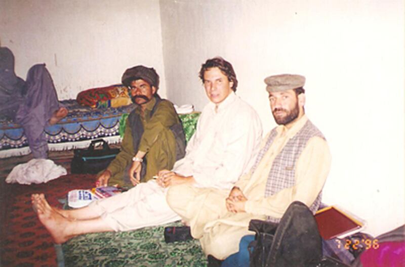 Mahsud says Mortenson was even made the guest of honor at the village’s annual soccer tournament. On one trip the villagers took Mortenson to the Ladha Fort, a government security outpost. On his laptop computer at his office in Islamabad, Mahsud shows a photo of Mortenson that was taken that July. The picture shows Mortenson, smiling, standing shoulder to shoulder with eight other men. They are all armed with AK-47s. So is Mortenson. He too is cradling an AK-47 with a huge 75-round magazine attached. “He claims we are all kidnappers,” says Mahsud. “You can clearly see this man is not a frightened, kidnapped man, but a very happy one.