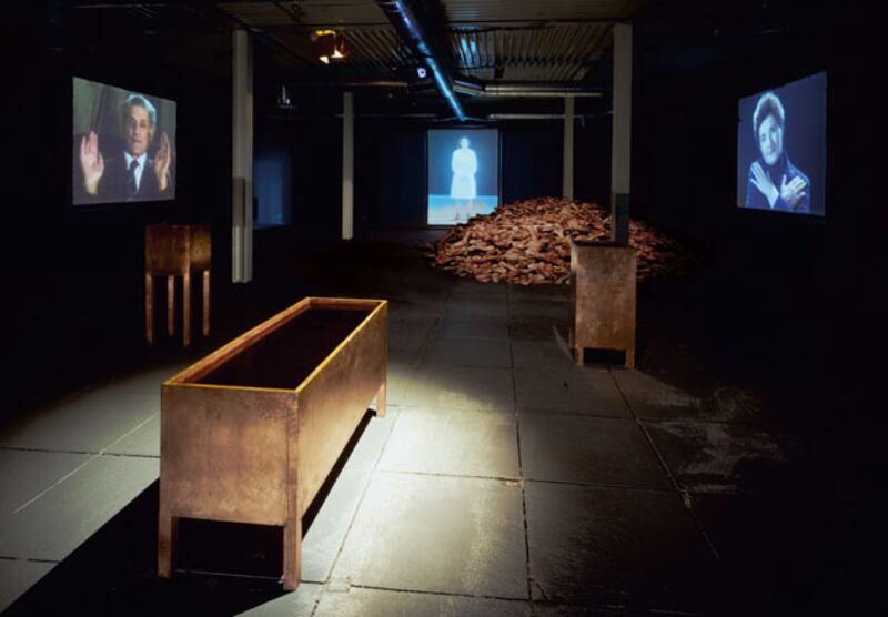 Performed in 1997 for four days, six hours each day at the 47th Venice Biennale Three-channel video (color, sound), copper sinks and tub filled with black water, bucket, soap, metal brush, dress stained with blood. 24:47 min. Original installation view