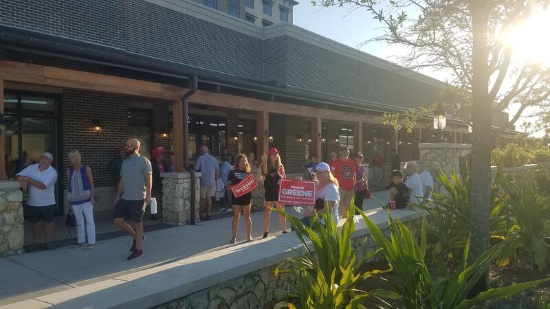 Inside, a trio of police officers turned away latecomers trying to enter a ballroom where a standing-room-only crowd of about 1,000 people arrived almost an hour earlier to hear Gaetz and Greene speak.