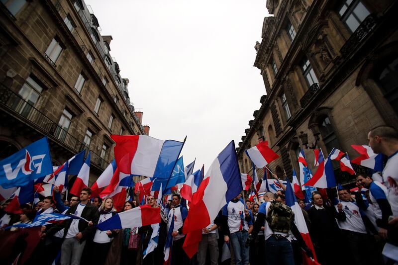 France’s far-right National Front party members chant slogans.