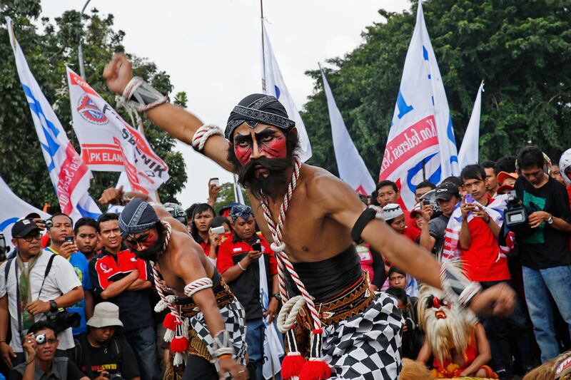 Traditional Javanese dancers perform in front of the presidential palace during a labor demonstration.