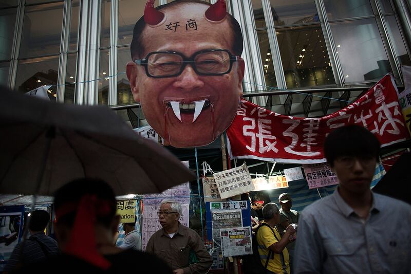 A cardboard caricature head of billionaire tycoon Victor Li, chairman of Cheung Kong Infrastructure Holdings Ltd., is displayed as hundreds of dock workers take part in a protest over pay and working conditions. According to the Hong Kong Confederation of Trade Unions, the stevedores have lowered their wage demands as the strike action over pay and working conditions enters its 34th day.