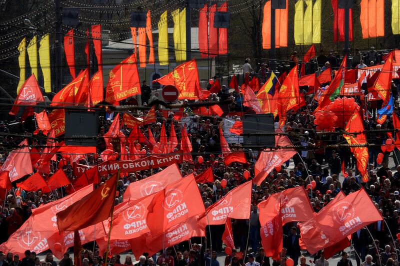 Communist Party activists carry red flags and banners in central Moscow.
