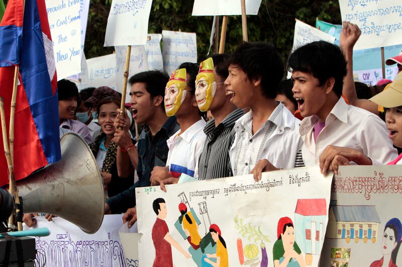 Cambodian garment-factory workers stage a rally. Participants called on the government for a raise in the minimum wage rate and for better working conditions.