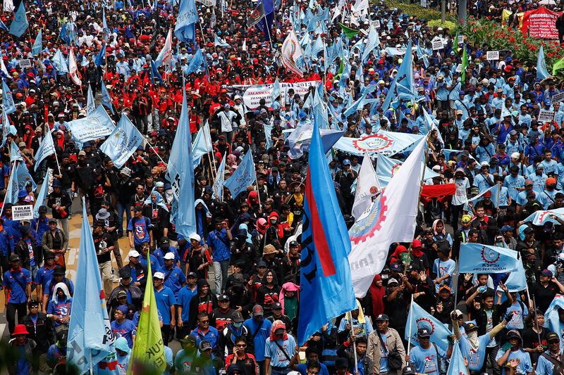 Tens of thousands of workers and labor activists marched through the central business district.